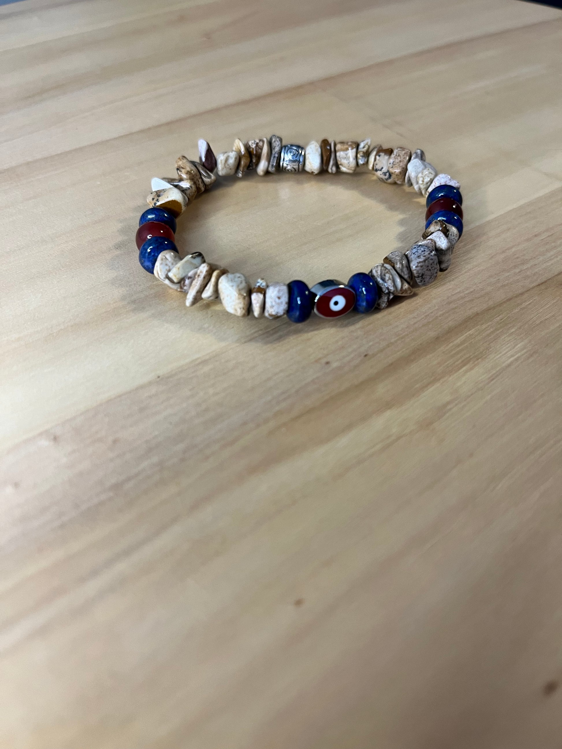 Handmade stretch bracelet featuring picture jasper nuggets, rich blue lapis lazuli, and carnelian accented with a protective eye motif. One size fits most.